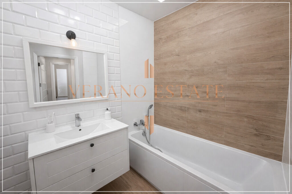 • Elegancka łazienka z wanną, pralką oraz zabudową meblową